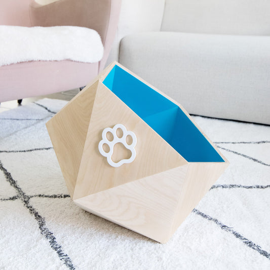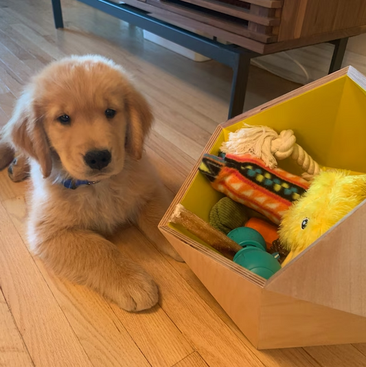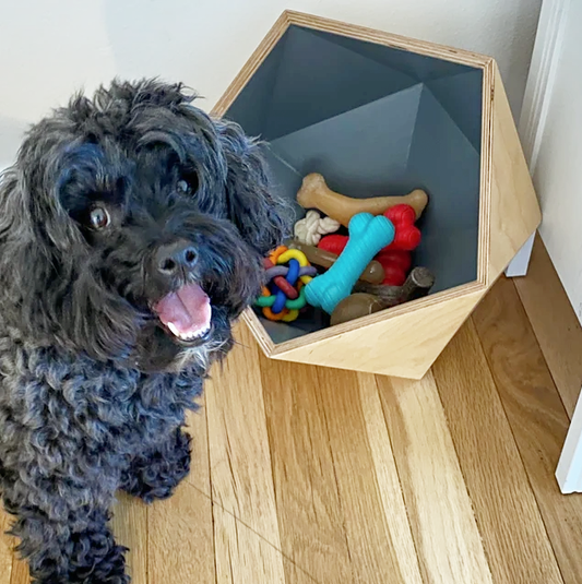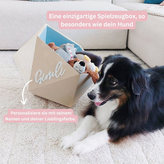 Entdecke unsere Spielzeugkisten aus Holz für Hundespielzeug in einem modernen Design und personalisierbar mit dem Namen deines Hundes oder einer Hundepfote.