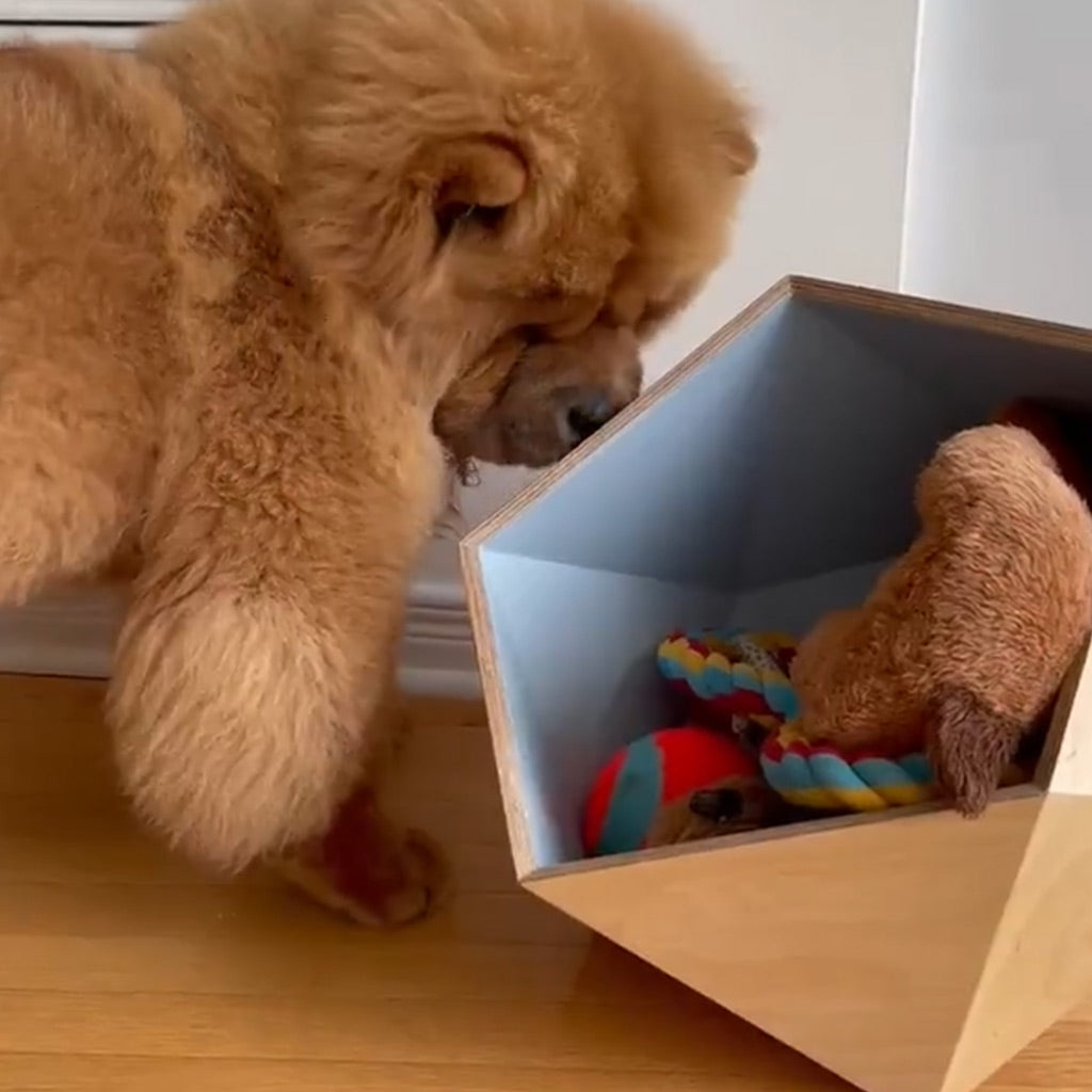 Die Aufbewahrungsbox aus Holz ist vorne abgeschrägt, damit dein Hund einfach hineinschauen kann und sein Spielzeug rausfrisch ohne die Spielzeugbox umzuwerfen.